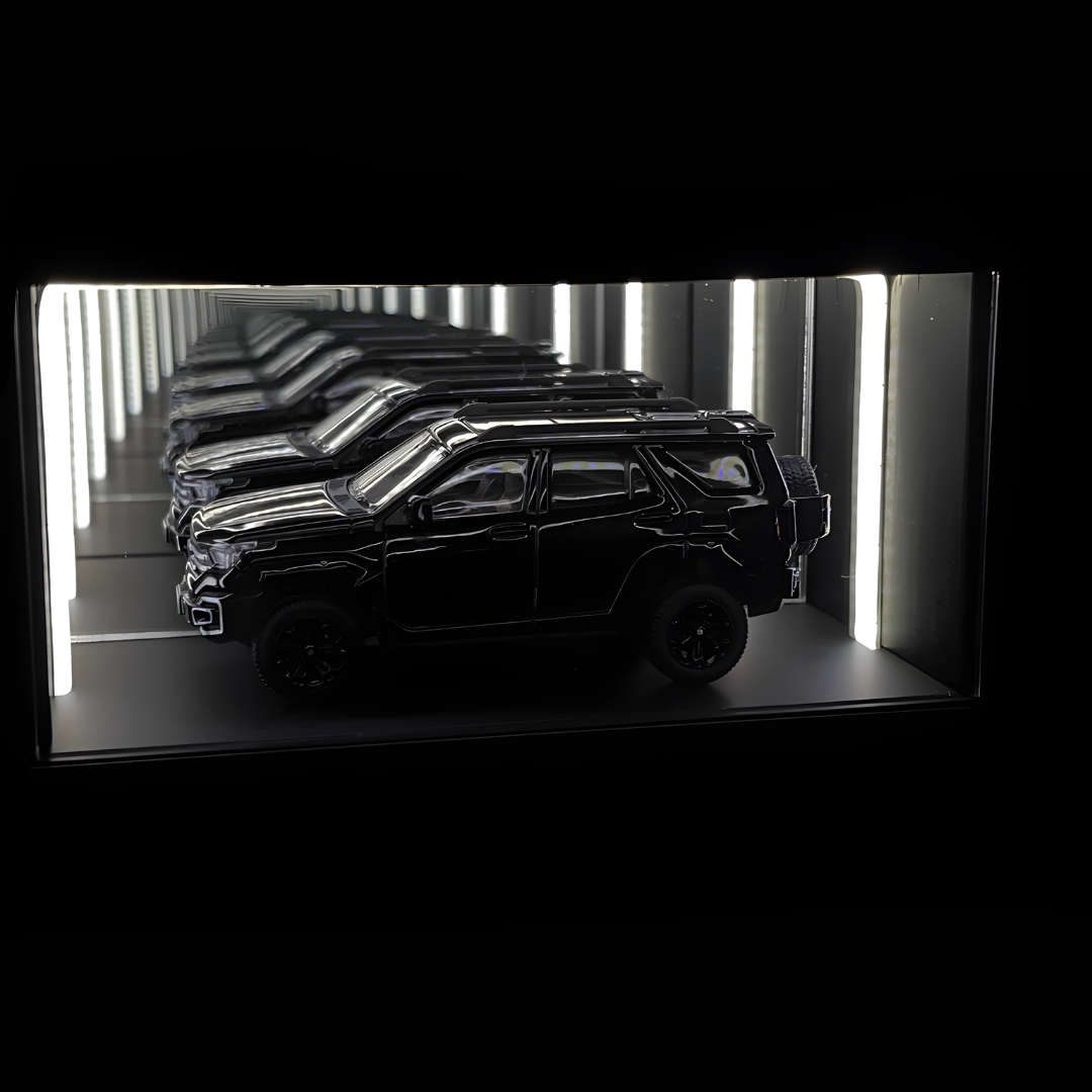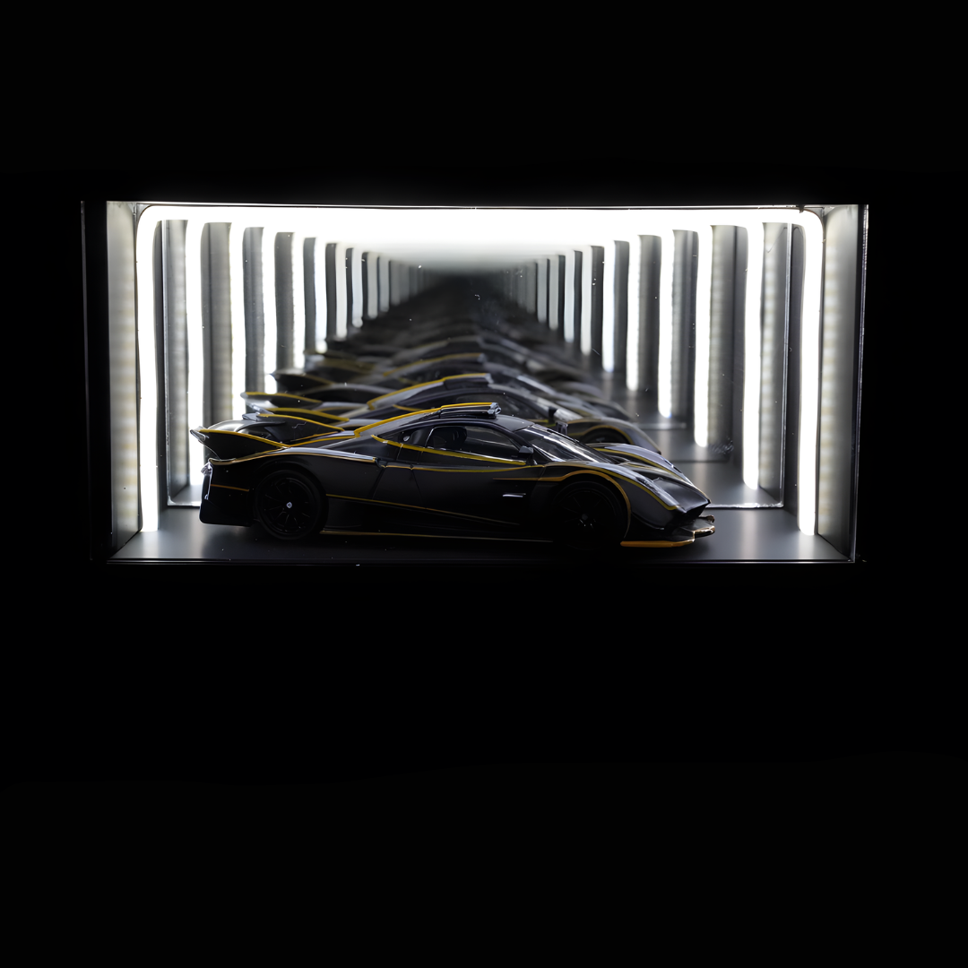 The Infinity Mirror Display Case creates a deep, immersive visual effect through layered reflections. When the LED white light turns on, the 1:64 car appears to race forward into an endless tunnel, enhancing depth and atmosphere.